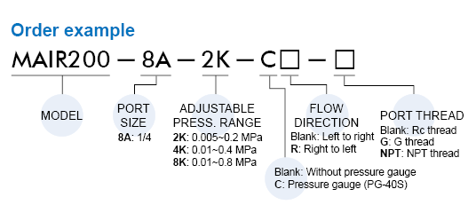 Port size: 1/16, 1/8, 1/4, Operating pressure range: 0~2 MPa.