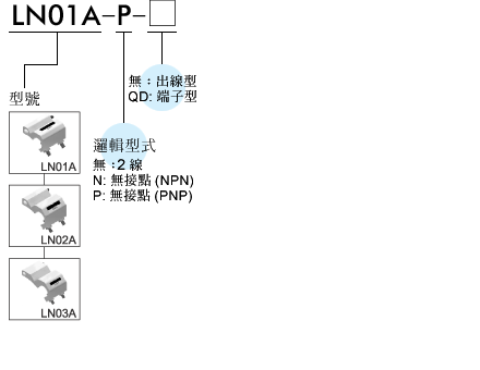LN0*A: 有接點, LN0*A-N: 無接點 NPN, LN0*A-P: 無接點 PNP |