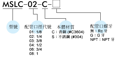 配管口徑 : R(G,NPT)1/8, 1/4, 3/8, 1/2, 3/4, 1,本體材質:青銅 (#C3604) , 不銹鋼 (#304) 可供選擇。